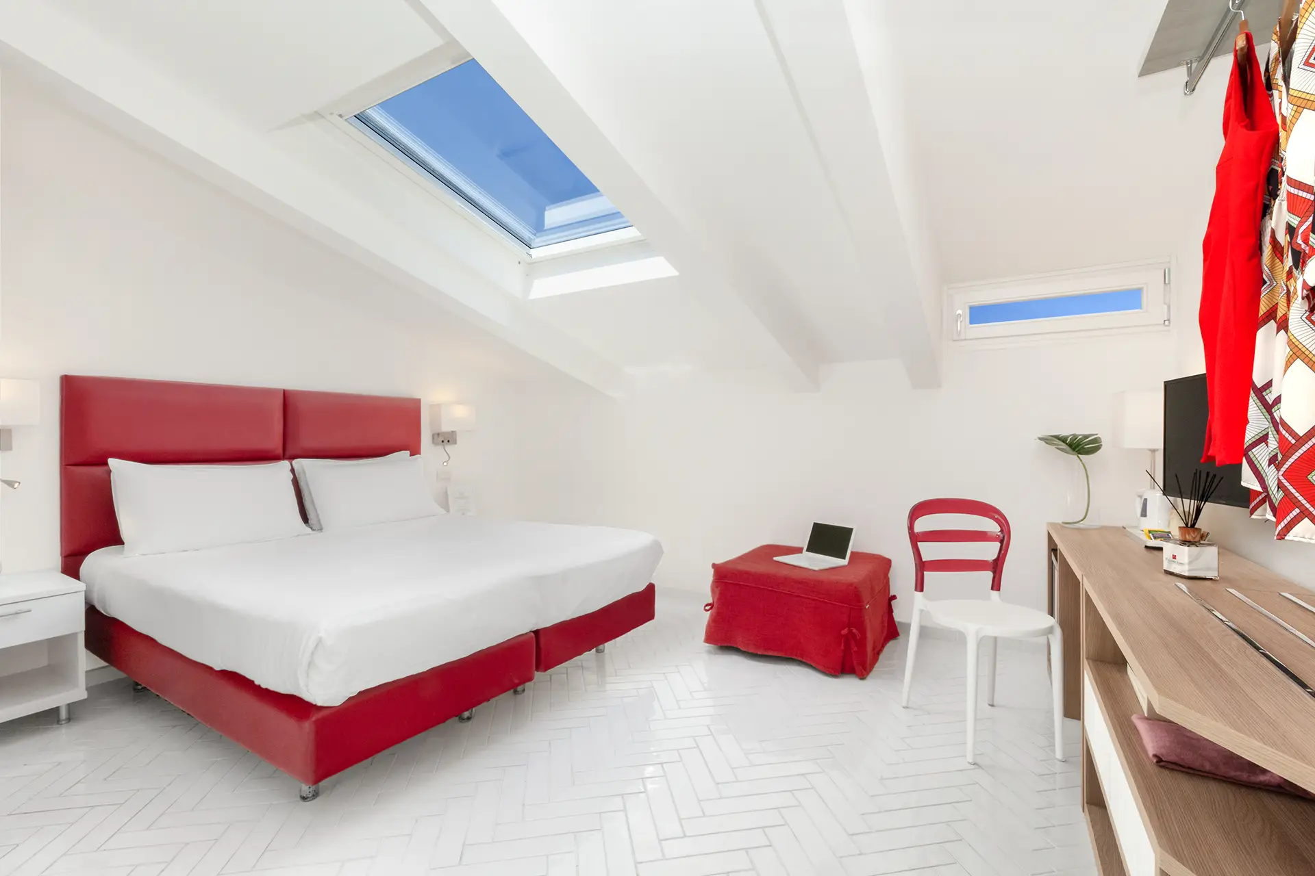 Con i suoi 17 m² al quarto piano di Palazzo Tasso, la Mansarda offre un’atmosfera suggestiva, lontana dal rumore e immersa nel silenzio.